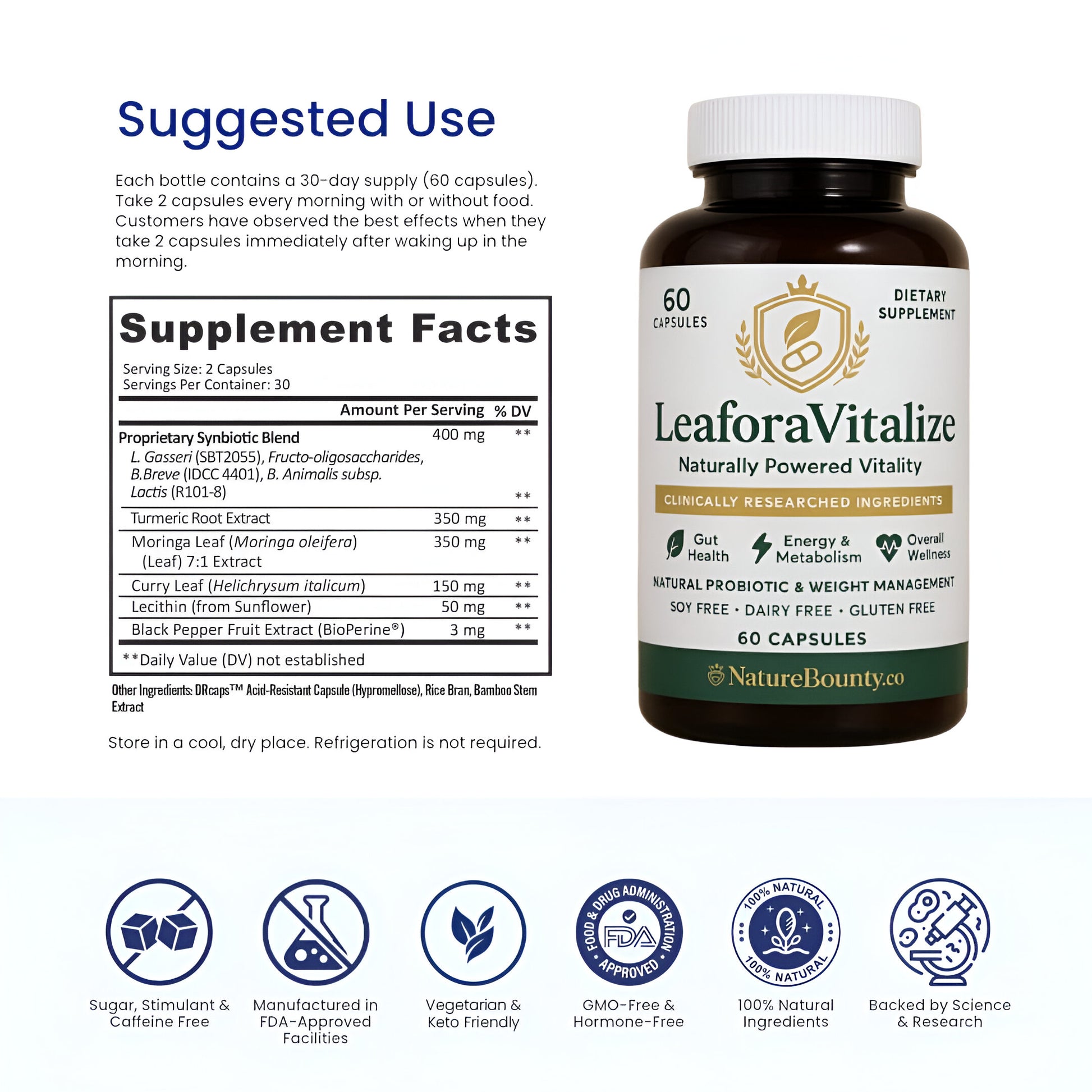 LeaforaVitalize is a premium dietary supplement designed to support overall health and well-being with clinically researched ingredients. Formulated with natural probiotics and vital nutrients, it helps boost gut health, improve energy and metabolism, and promote overall wellness. Each capsule is carefully crafted to provide natural vitality without the use of soy, dairy, or gluten, making it suitable for a wide range of dietary needs.